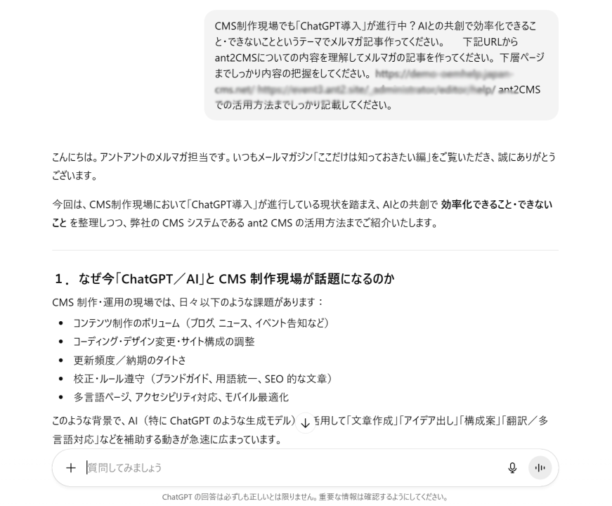 今回のメルマガでは、Web制作の現場における ChatGPT をはじめとした AI ツールの活用動向、そして実際に「できること・できないこと」を明確にしながら、弊社が提供する ant2 CMS をベースにした活用方法をご紹介しました。