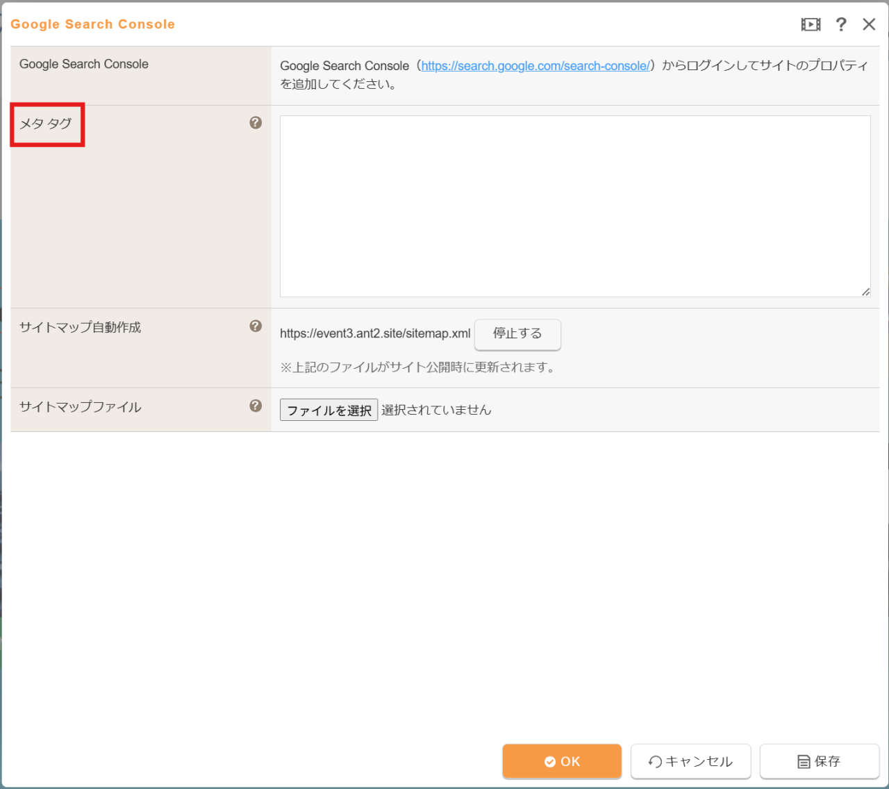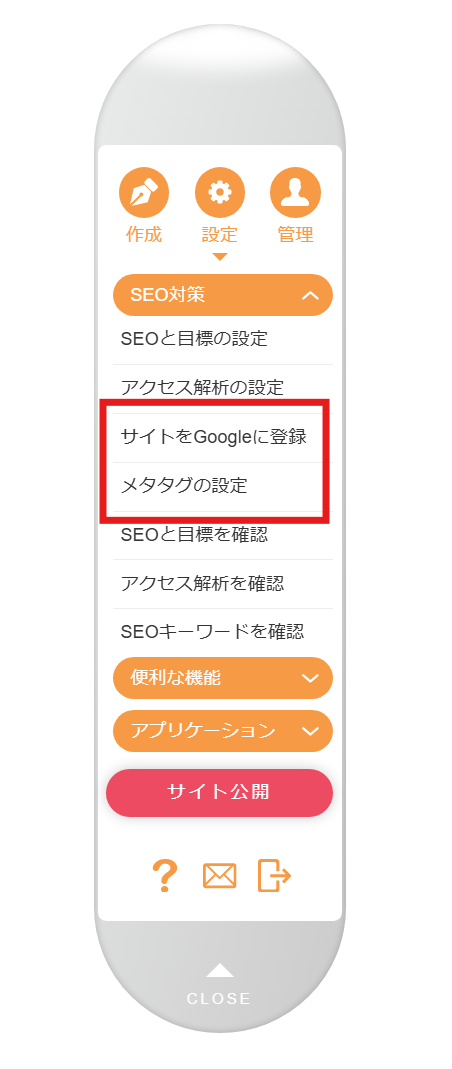 「Googleサーチコンソール」機能または、対象ページの「メタタグ」を選択