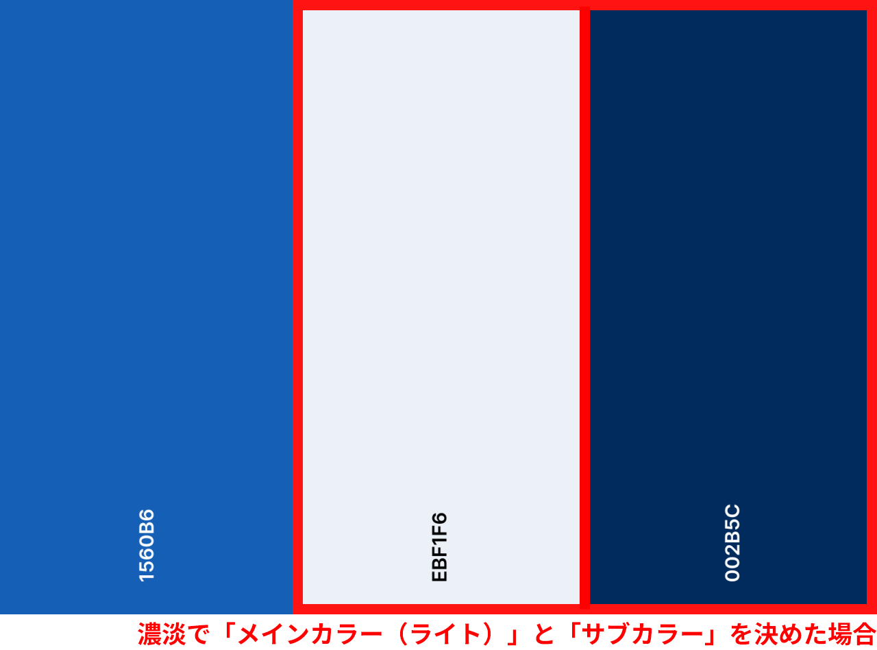 メインカラーと同じ色味の色を薄くして少しグレーを混ぜたものを「メインカラー(ライト)」に、逆に明度を落として濃くしたものを「サブカラー」に設定して濃淡で色を決めるとサイト全体に統一感が生まれます。